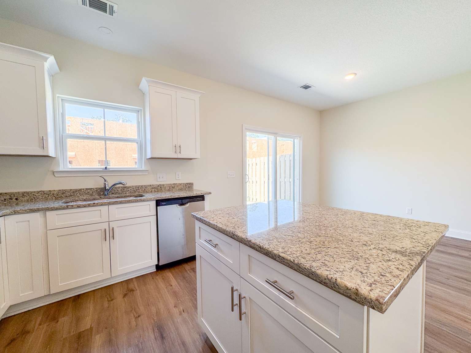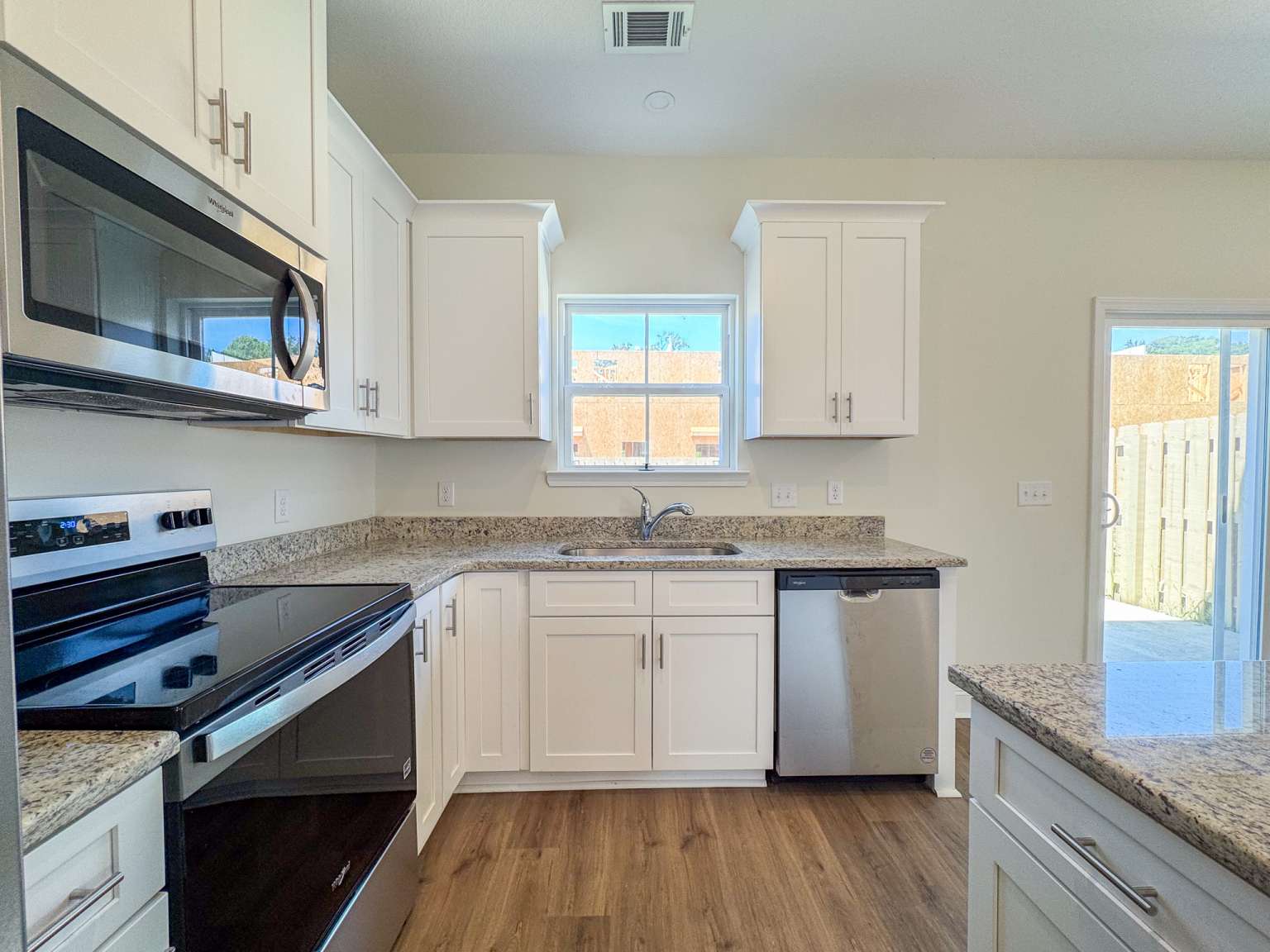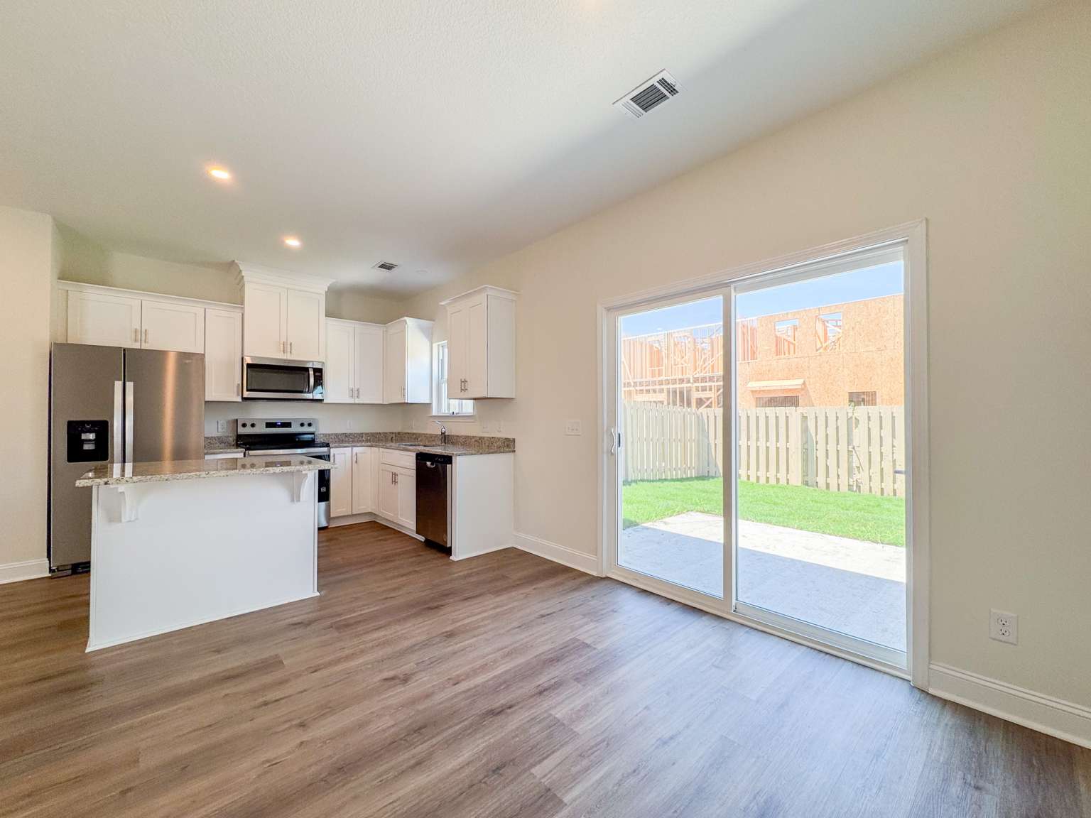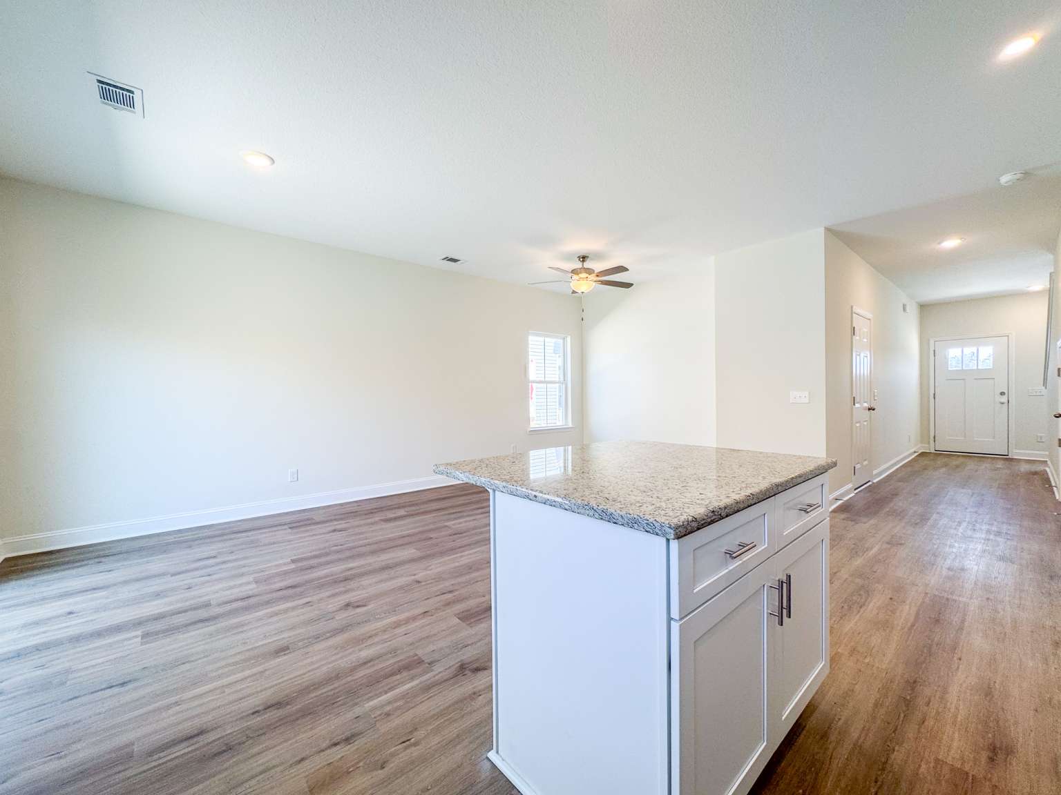 Move-in ready end-unit townhome at Heritage Pointe Townhomes in Hinesville! Located on the edge of Hinesville, close to new restaurants & up-and-coming shopping! Quick commute to Ft. Stewart, Hwy 17 & I-95! 3-bedroom, 2.5-bath townhome with granite counters throughout! Open living space on the first floor with access to the 1-car garage, half-bath & the backyard. The kitchen features a spacious pantry & new stainless steel appliances, including a refrigerator! From the island, look out to the dining area & family room, which features a ceiling fan. Enjoy a fenced & sodded backyard with irrigation from the patio! Upstairs, find two bedrooms, a hall bath, a laundry room & the primary suite. Within the primary suite is a ceiling fan, a walk-in closet & private bath. The private bath includes a dual vanity with granite counter & another walk-in closet! HOA to provide regular landscaping & annual pressure washing.