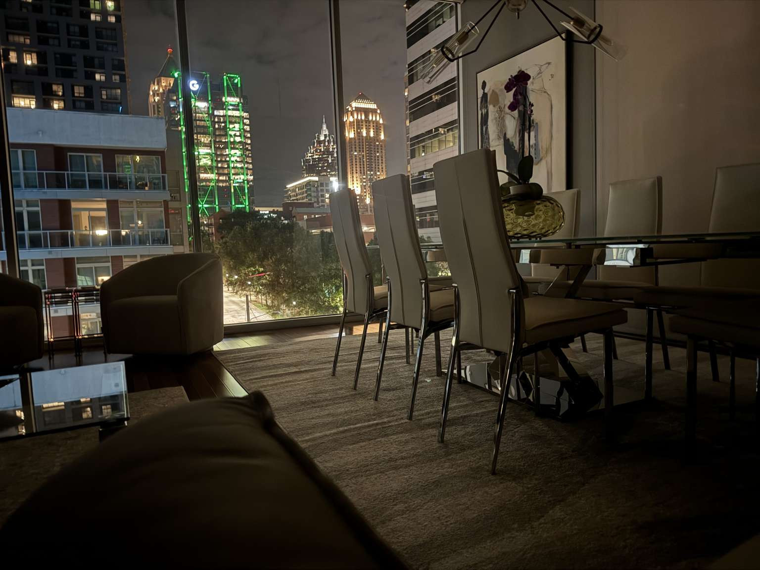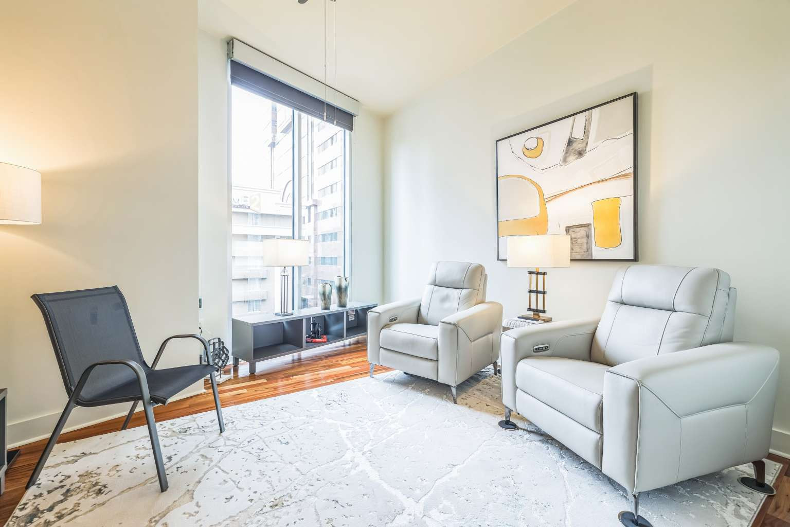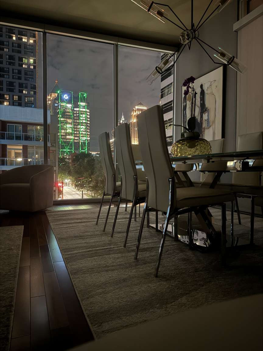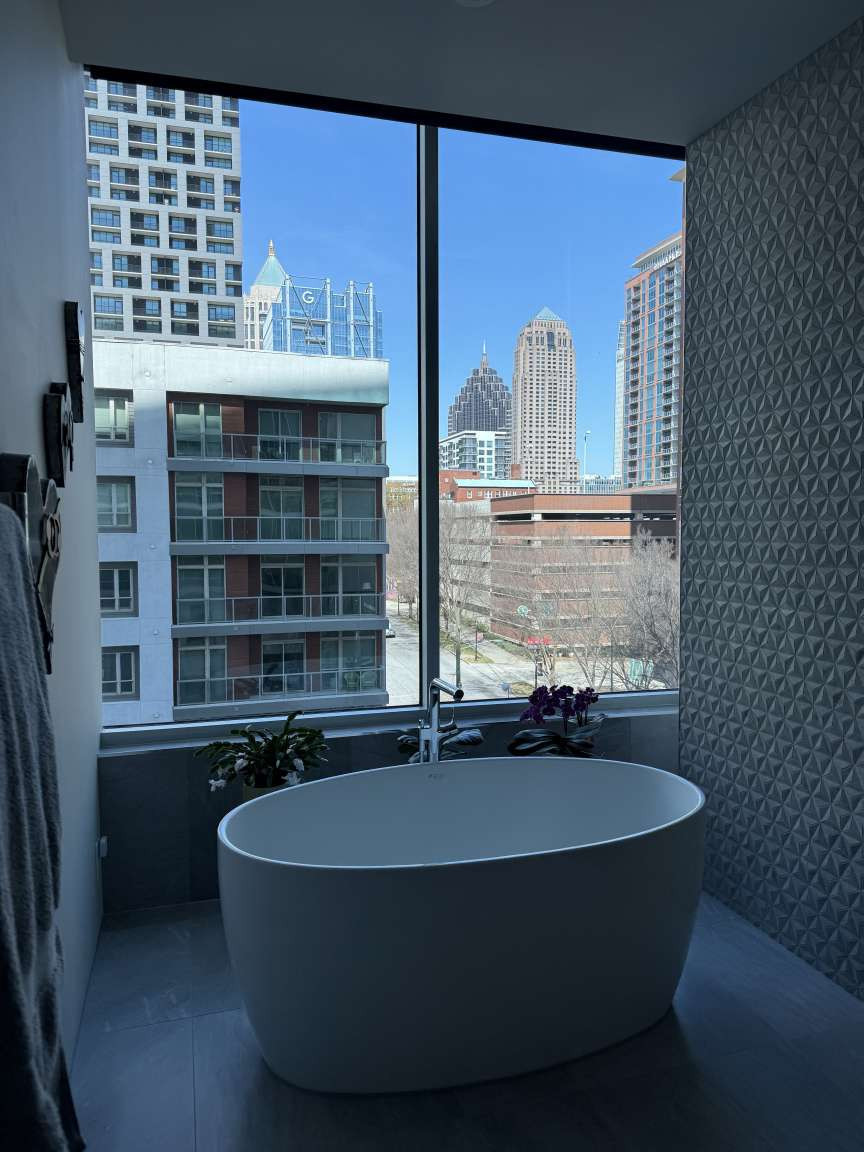 Boutique, high-rise 2bed/2bath condo in heart of Midtown! With 24 hours concierge, this 84 unit North facing condo building was designed for privacy. Each condo has its own elevator that opens directly to a vestibule for each home! This 6th floor unit is the largest 2bed/2bath floor plan in the building but is very private with only 2 other condos on this floor. The kitchen was totally renovated with Quartz counters, Sub-Zero refrigerator, a Sub-Zero wine fridge, Wolf oven, 5 burner induction cooktop, vented hood, and Bosch dishwasher. The spacious walk-in pantry is just off the kitchen with custom cabinets. The oversized primary suite includes a totally renovated primary bath with beautiful tiled walk-in shower and a separate soaking tub with amazing views of Midtown skyline!! There is a custom walk-in closet in the primary bedroom. At the other end of the condo there is a large second bedroom with a fully renovated ensuite bathroom including a large beautifully tiled walk-in shower, and two closets. This open and spacious floor plan with floor to ceiling windows in every room offers sweeping panoramic views of the Atlanta skyline. Newly painted and many custom high-end upgrades including cellular shades on every window. Both bedrooms and the primary bath also have blackout cellular shades. Custom lighting, heated windows to reduce interior window moisture, a newer HVAC system, full sized front-loading washer & dryer and a 50-gallon hot water heater! There is also a large covered and very private terrace off the living area that extends the home for outdoor living. A separate door in the private vestibule elevator area opens directly to the amenities on the same floor so you are just a few steps away from the gym, pool, the grill and cabana areas and even the guest suite is nearby. This is as private, resort style living as it gets while being in the heart of Midtown and just steps away from everything! It is just 2 blocks to MARTA, and a few blocks to great restaurants, Publix and Whole Foods, the High Museum, Piedmont Park, the Beltline and Fox Theater. The new furniture is also available for purchase under a separate contract!