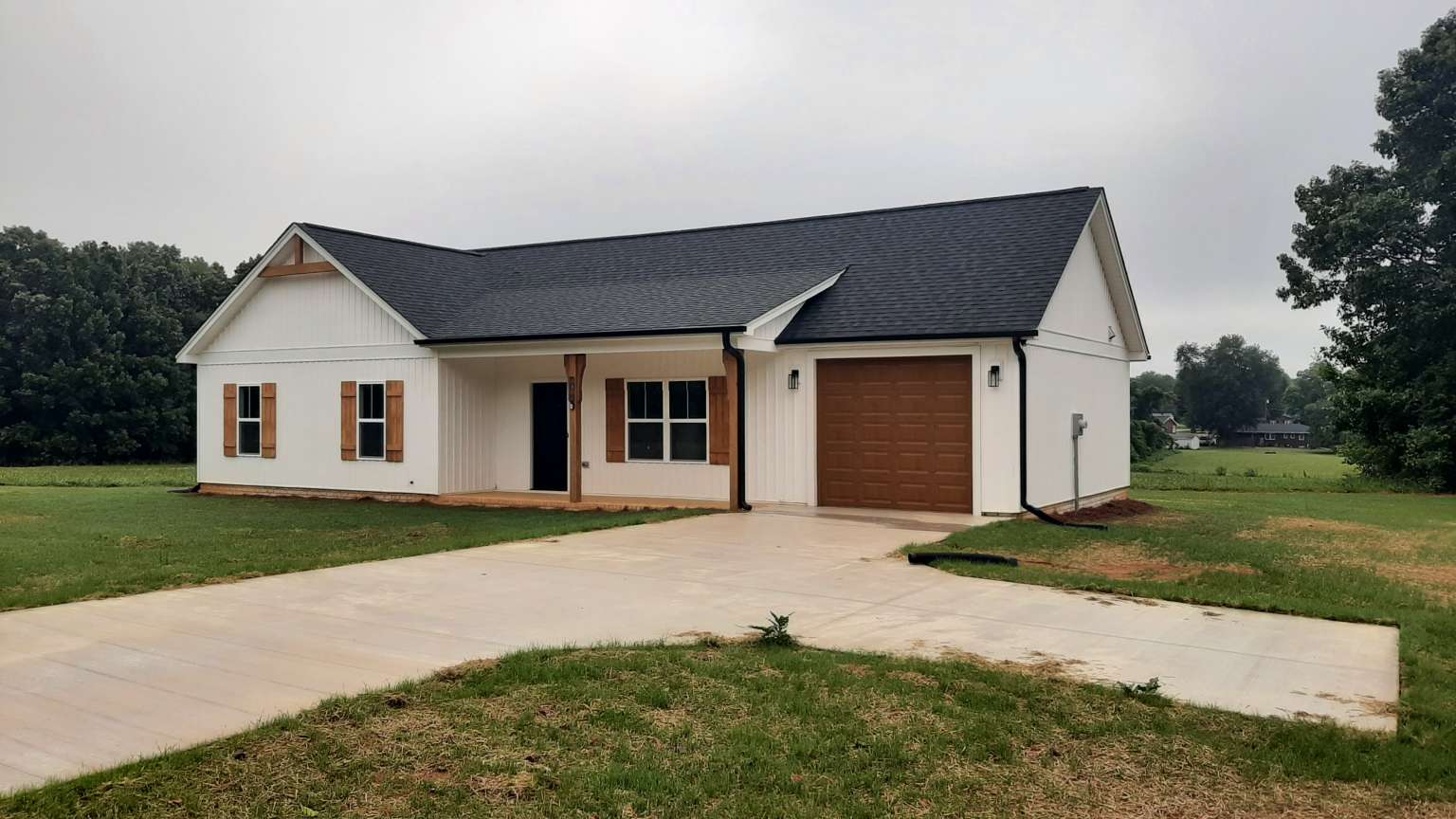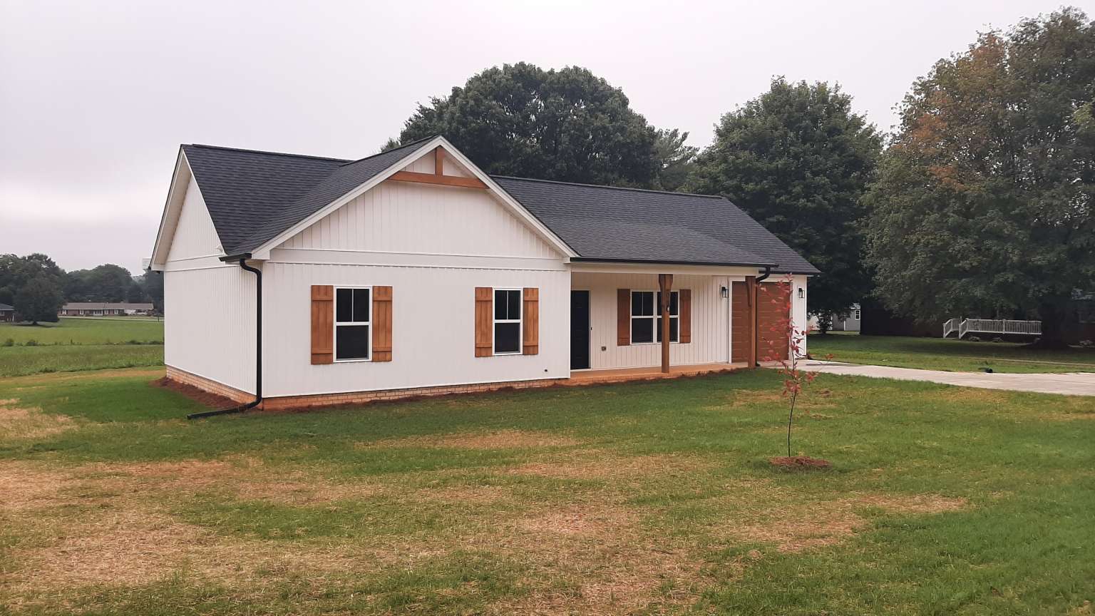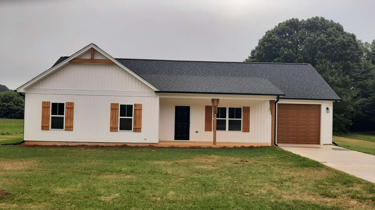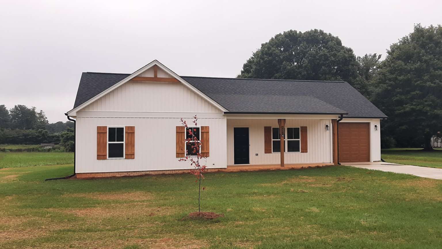 New construction in convenient location with low Yadkin taxes. Exterior Features include: • Low maintenance exterior • Cedar timber accents and shutters • Brick front and side foundation • Rocking chair front porch • High performance windows • Architectural roof shingles • Board and batten siding • Deck off of dining room • Insulated garage door with remote opener • Public water, private septic • 0.63 acre lot Interior Features include: • Primary bedroom suite with private bathroom • Tile shower and custom glass door • Walk-in closet space with solid wood shelving • Flat panel solid wood cabinetry • Honed Granite countertops • Stainless steel appliances • Plank floors throughout • Gas fireplace in living room • Open concept living/dining/kitchen area with cathedral ceiling • Solid wood baseboard and trim • Tub/shower combo in 2nd bath • Laundry center conveniently near bedrooms • Extra deep garage • High efficiency heat pump and air conditioning