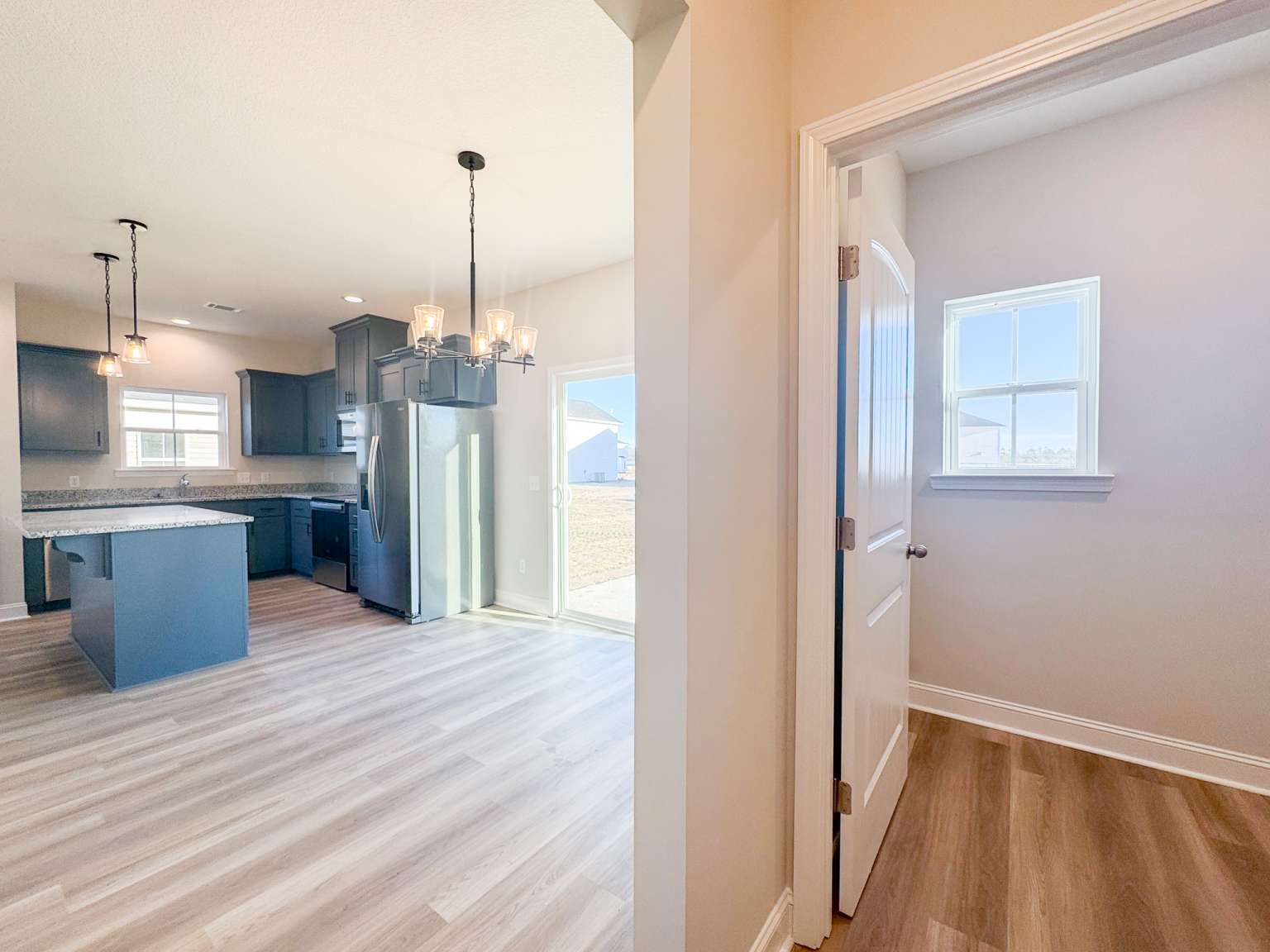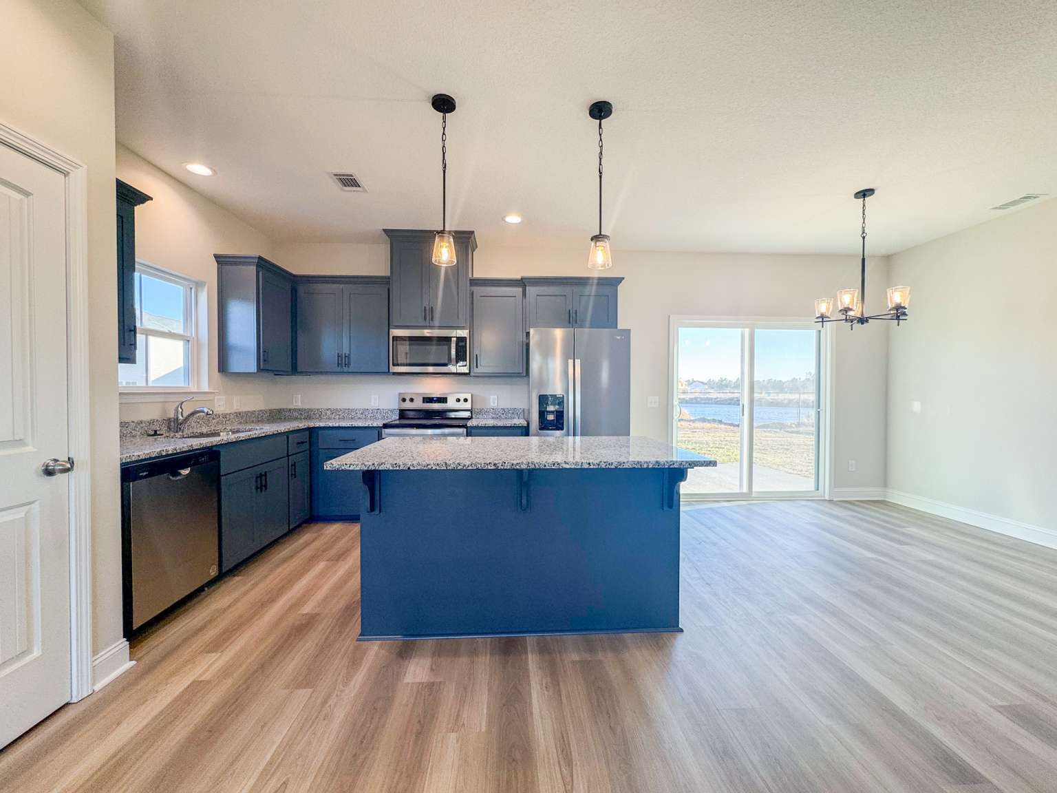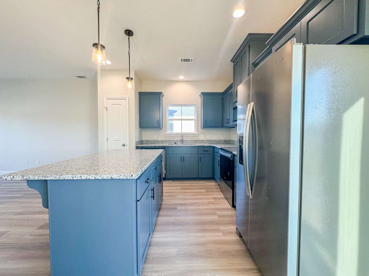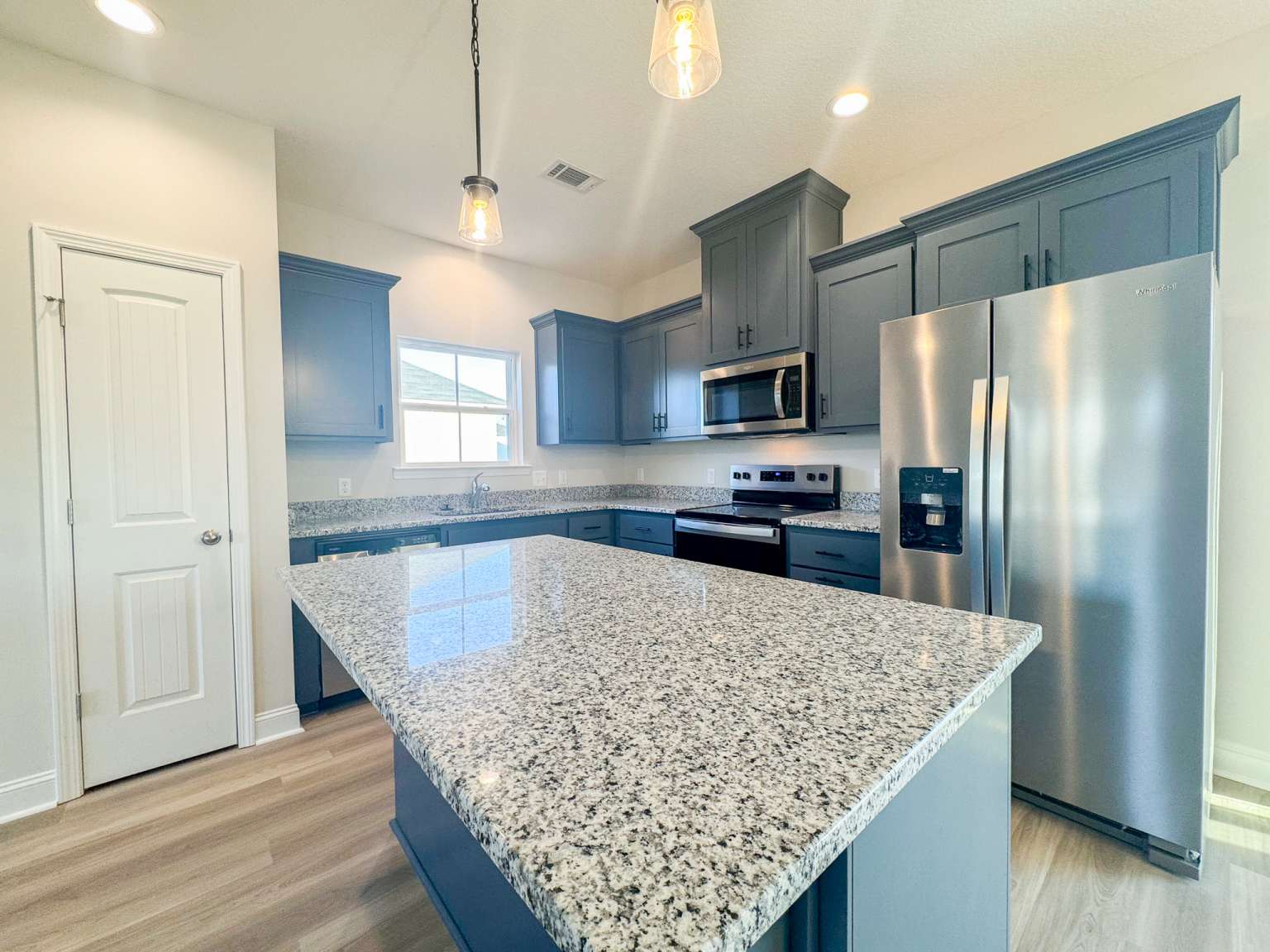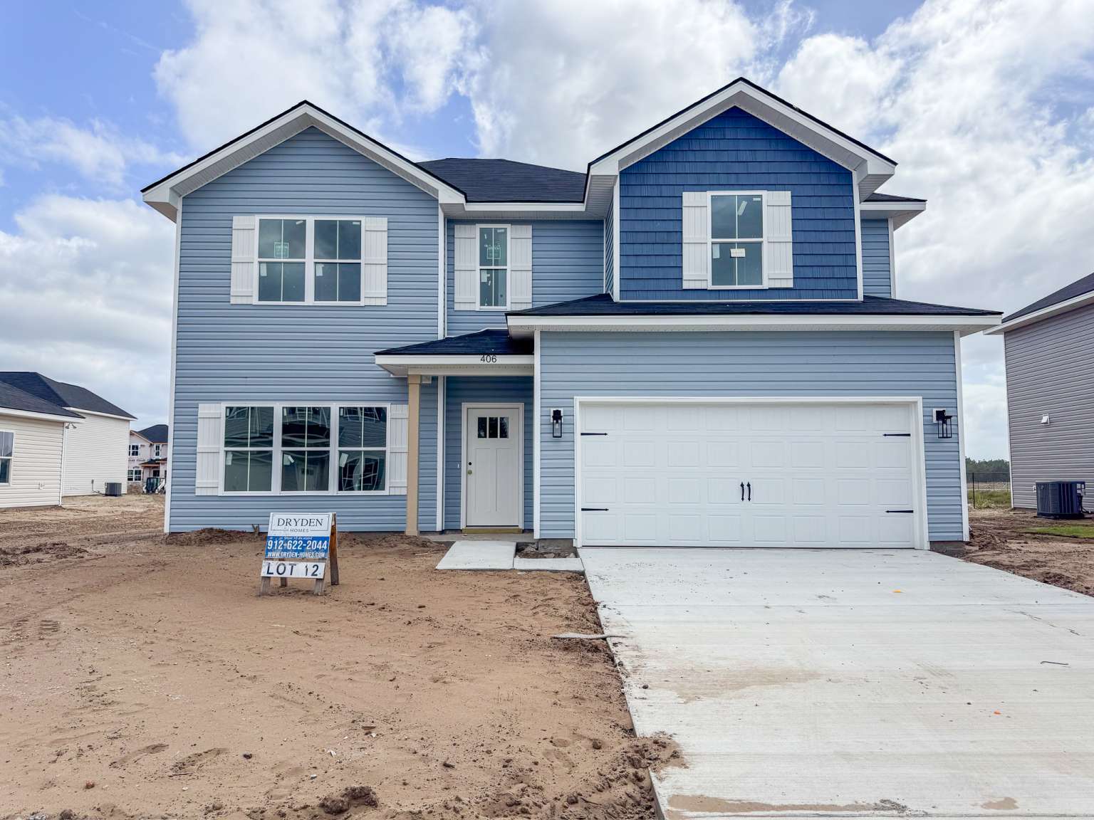 Discover this stunning two-story home in Liberty County’s newest neighborhood—perfectly positioned near Hinesville, Ludowici, and Fort Stewart. Step inside to a bright, open-concept layout designed for effortless living and entertaining. The spacious family room flows seamlessly into the dining area and a modern kitchen featuring striking blue cabinetry, granite countertops, and stainless steel appliances. Durable plank flooring runs throughout the main level, adding both style and function. From the dining area, enjoy easy access to the patio, garage, half bath, and laundry room. Upstairs, unwind in the primary suite with two walk-in closets and a luxury bath complete with a soaking tub, separate shower, and dual granite vanity. Two additional bedrooms and a full hall bath with granite vanity complete the second floor. Estimated completion: December 2025.