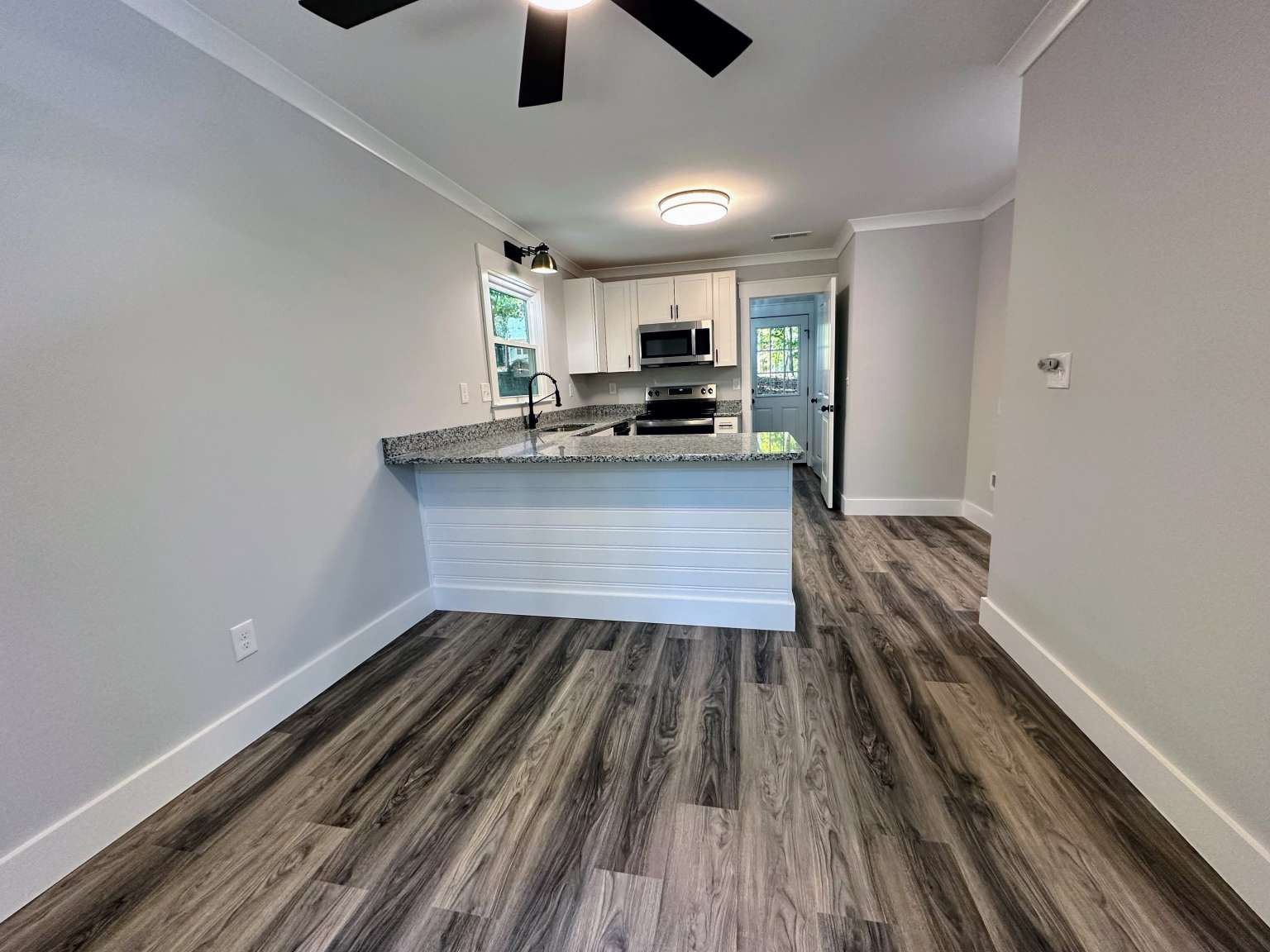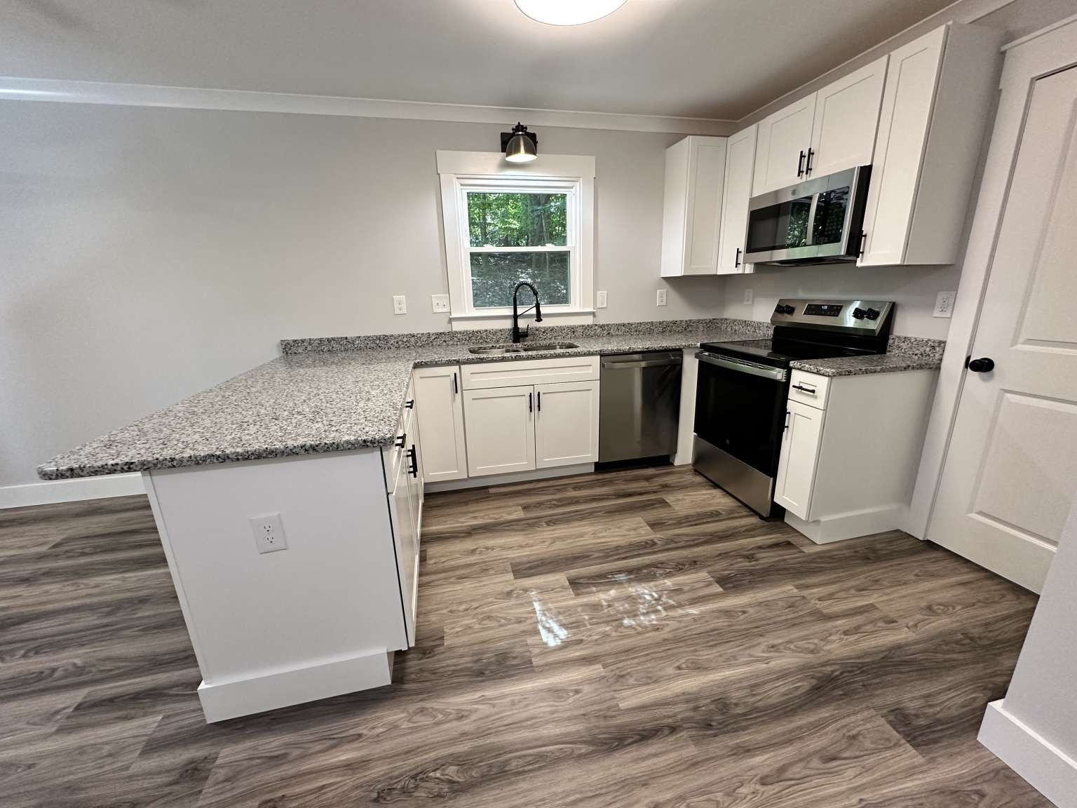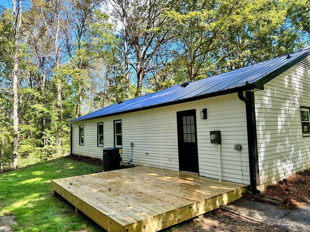 Hurry to see this show-stopper! This home has been totally remodeled from the inside out, and is gorgeous! Step inside the front door to a large living room with a beautiful, newly re-finished fireplace. Or step into the dining area, which is open to a completely new kitchen. The kitchen features white cabinetry, granite counter-tops, black lighting fixtures, & stainless steel appliances. Have a quick lunch at the kitchen bar, or slow down for a relaxed dinner in the dining area. But the large master bedroom & bathroom are truly amazing! An exquisite barn door offers privacy for the master bath that features a new bathtub, toilet, vanity & new black fixtures. A walk-in closet is behind the master bathroom. Outside, check out the beautiful landscaping, full concrete driveway, & peaceful, private back yard. New metal roof, new heat pump, & new tankless water heater. All of this on a private wooded lot, in a great neighborhood, & just minutes from shopping & dining!