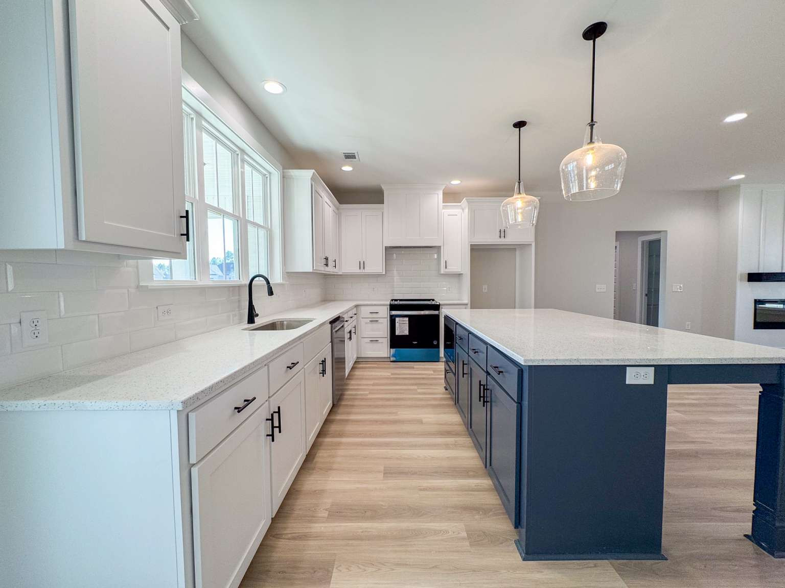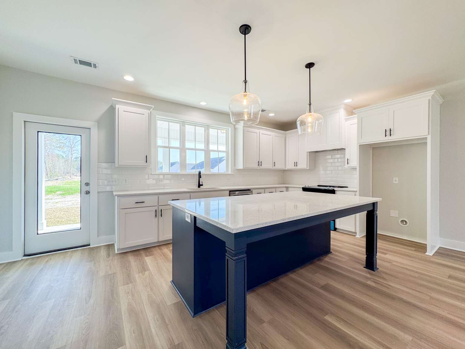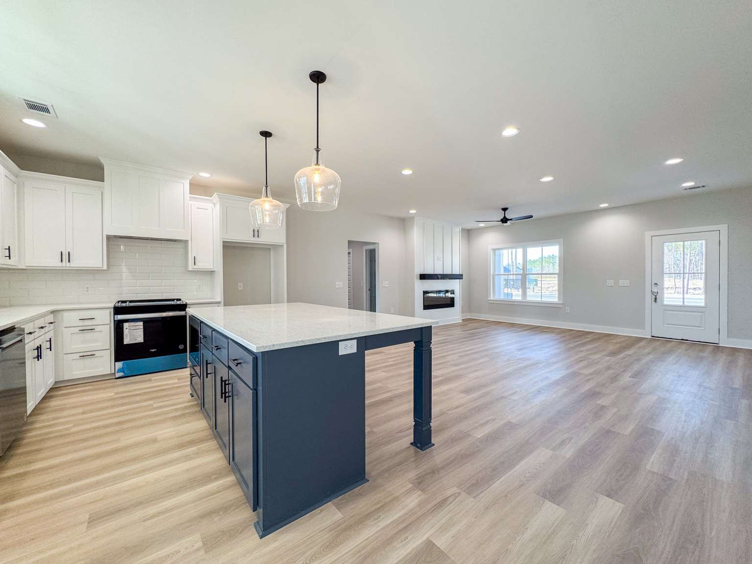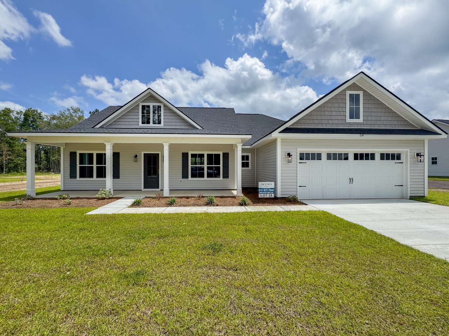Timmons plan on a half-acre lot in Cottages on Carter! Minutes to I-95 & Hwy 17! Step inside from the spacious front porch & find a modern open living space! The family room with an electric fireplace transitions seamlessly to the dining area & then the kitchen. Enjoy quartz counters & tile backsplash paired with two-tone cabinetry in the kitchen with a walk-in pantry just around the corner! Step out to your back porch from the kitchen to enjoy your backyard! With its split layout, enjoy a private primary suite off the living space via a hallway that also leads to a half bath, laundry room & garage access. The primary bedroom has plank flooring, a walk-in closet & private bath. The luxurious bath includes tile floor, soaking tub, tile shower with pan insert & quartz vanity counters. Across the home are two additional bedrooms that share a hall bathroom.