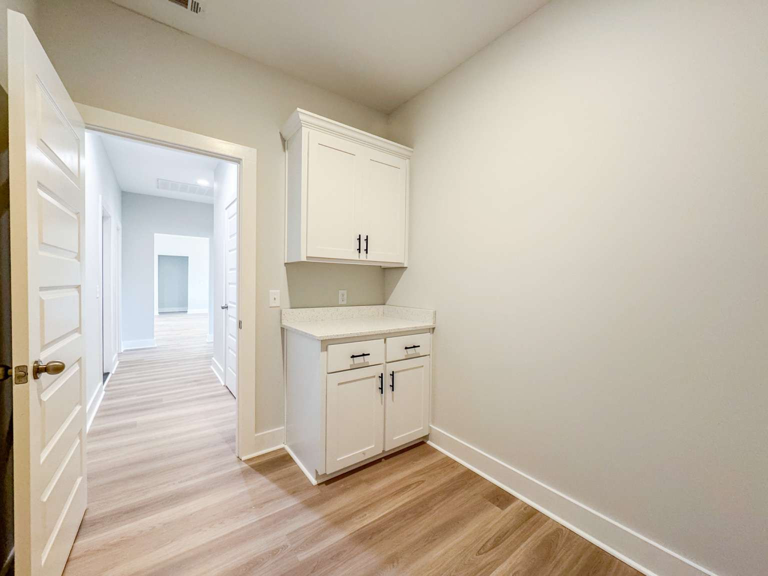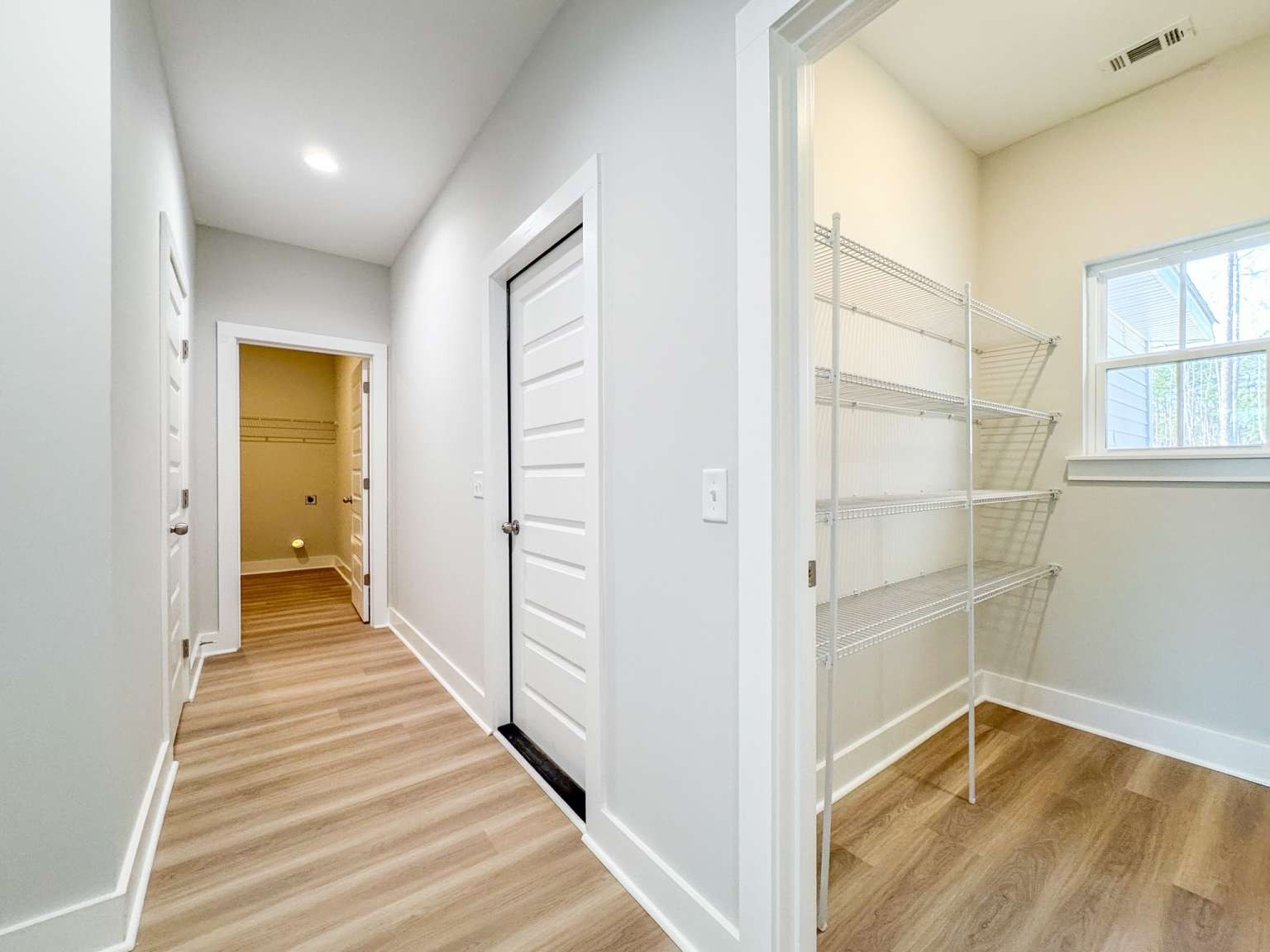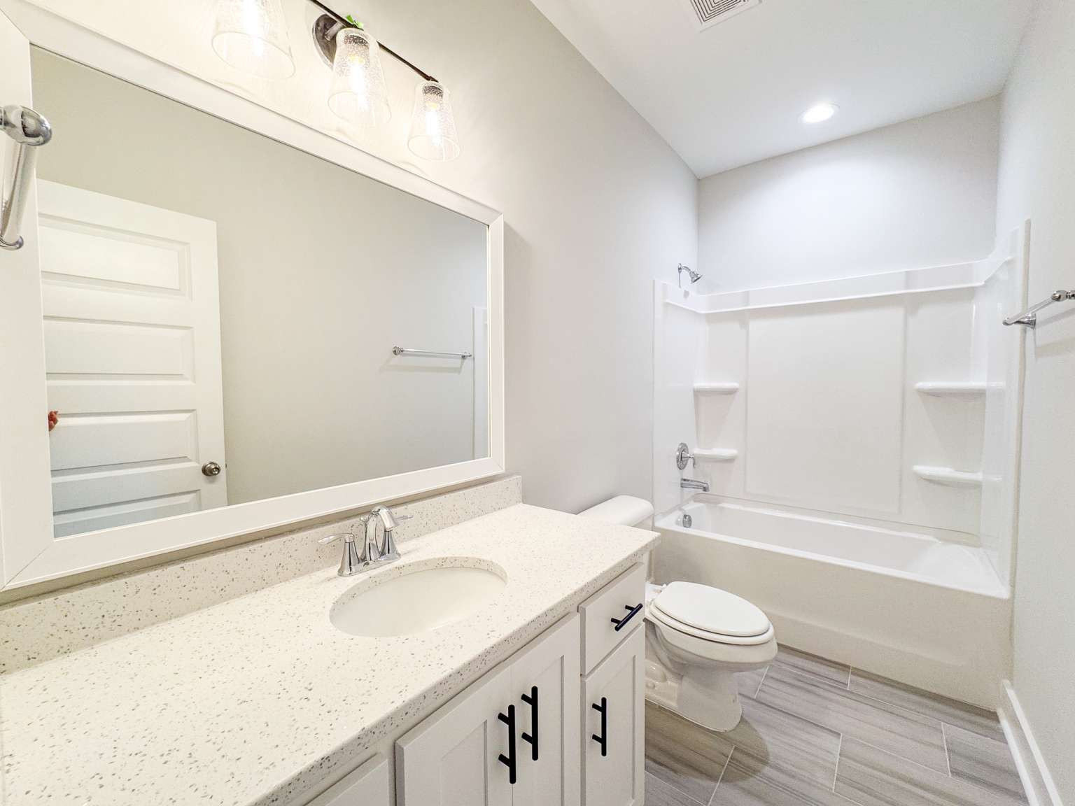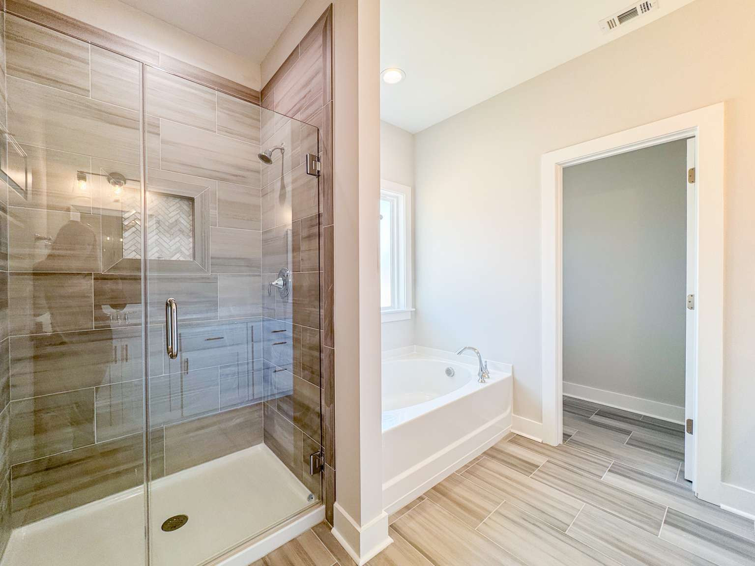 Timmons plan on a half-acre lot in Cottages on Carter! Minutes to I-95 & Hwy 17! Step inside from the spacious front porch & find a modern open living space! The family room with an electric fireplace transitions seamlessly to the dining area & then the kitchen. Enjoy quartz counters & tile backsplash paired with two-tone cabinetry in the kitchen with a walk-in pantry just around the corner! Step out to your back porch from the kitchen to enjoy your backyard! With its split layout, enjoy a private primary suite off the living space via a hallway that also leads to a half bath, laundry room & garage access. The primary bedroom has plank flooring, a walk-in closet & private bath. The luxurious bath includes tile floor, soaking tub, tile shower with pan insert & quartz vanity counters. Across the home are two additional bedrooms that share a hall bathroom.