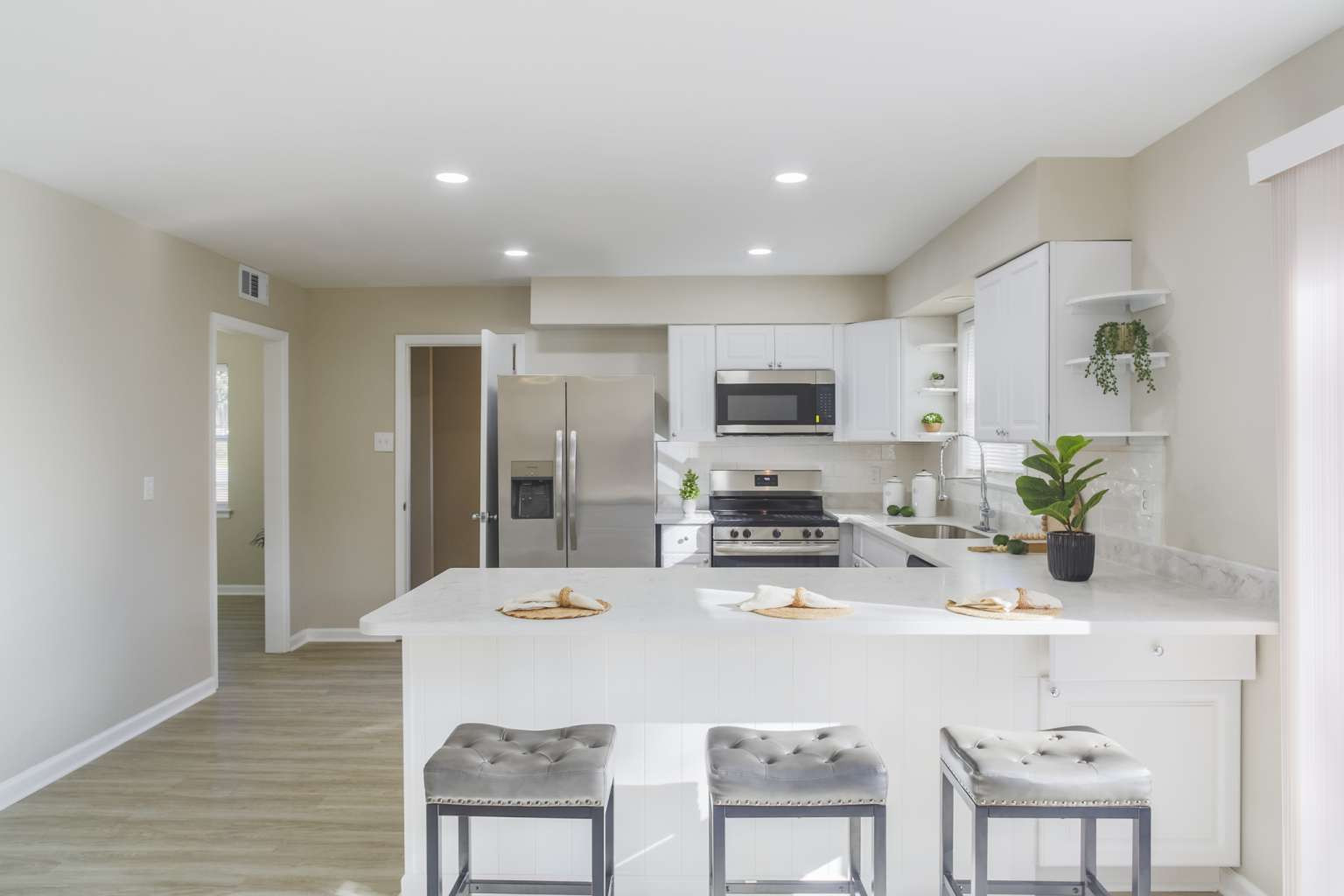Discover this updated 3-bed, 2-bath brick ranch with 1,708 sq. ft. of living space in a quiet, convenient Savannah location. The living room and formal dining area transition seamlessly to a newly designed kitchen, featuring abundant cabinetry, new stainless-steel appliances, and a contemporary kitchen bar that accommodates both entertaining and everyday use. New bathrooms feature tiled showers and vanities. New flooring, New windows, and additional improvements included. Experience outdoor relaxation in a private, fenced backyard featuring mature trees and lush greenery—perfect for outdoor activities or gardening. The property also offers a spacious driveway. This move-in-ready home is minutes from downtown, shopping, dining, and Savannah's attractions. Schedule a tour today.