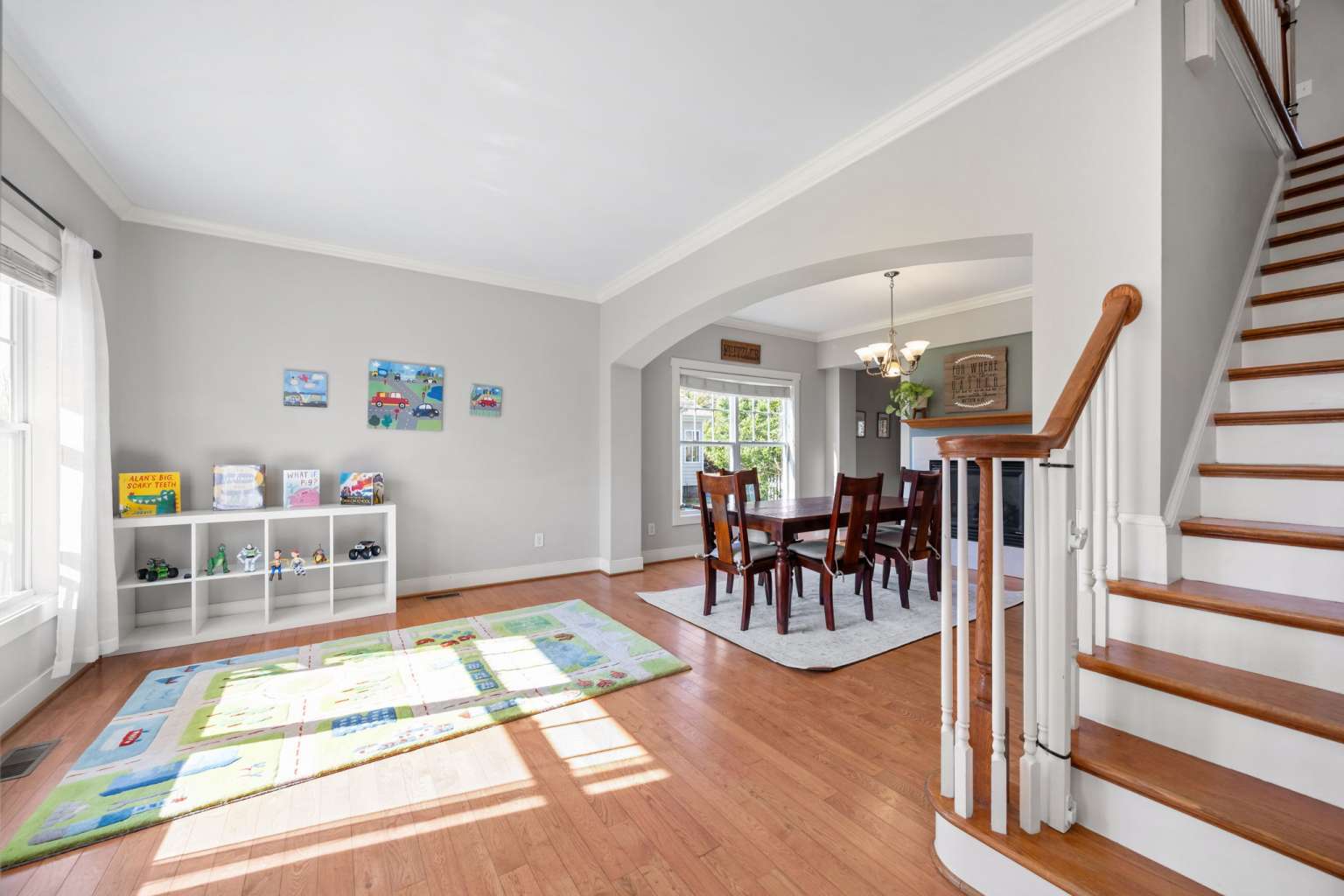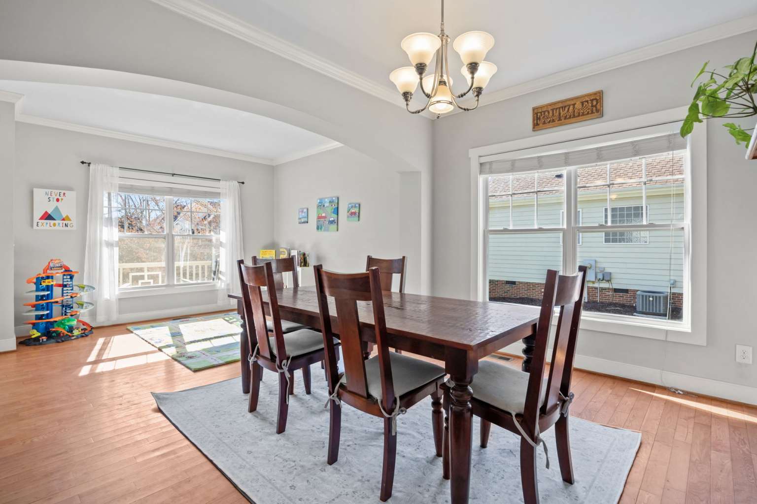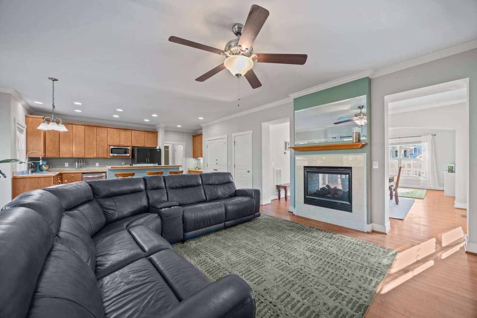 Spacious 4-bedroom home in Chatham Forest featuring 9-foot ceilings, hardwood floors, and a large primary suite, just 3 minutes from downtown Pittsboro with easy access to Chapel Hill and Apex. A welcoming covered front porch and two mature shade trees create inviting curb appeal. The main level offers a bright living and dining space with a double-sided fireplace, perfect for entertaining. The kitchen includes a breakfast bar, room for a table, and views of the fenced backyard. A main-floor guest bedroom and 3/4 bath provide flexible living options for guests or family. Upstairs includes a large primary suite with en-suite bath and walk-in closet, two large bedrooms, a dedicated office space, and generous walk-in storage. Outdoor living is easy on the spacious deck overlooking the .25-acre fenced lot. Major improvements include roof (2023), second-floor HVAC (2023), crawlspace encapsulation with dehumidifier, interior French drain and sump (2024), radiant attic barrier (2024), ultra-quiet garage door opener (2025), and water heater (2026), making this home comfortable and low-maintenance for years to come.
